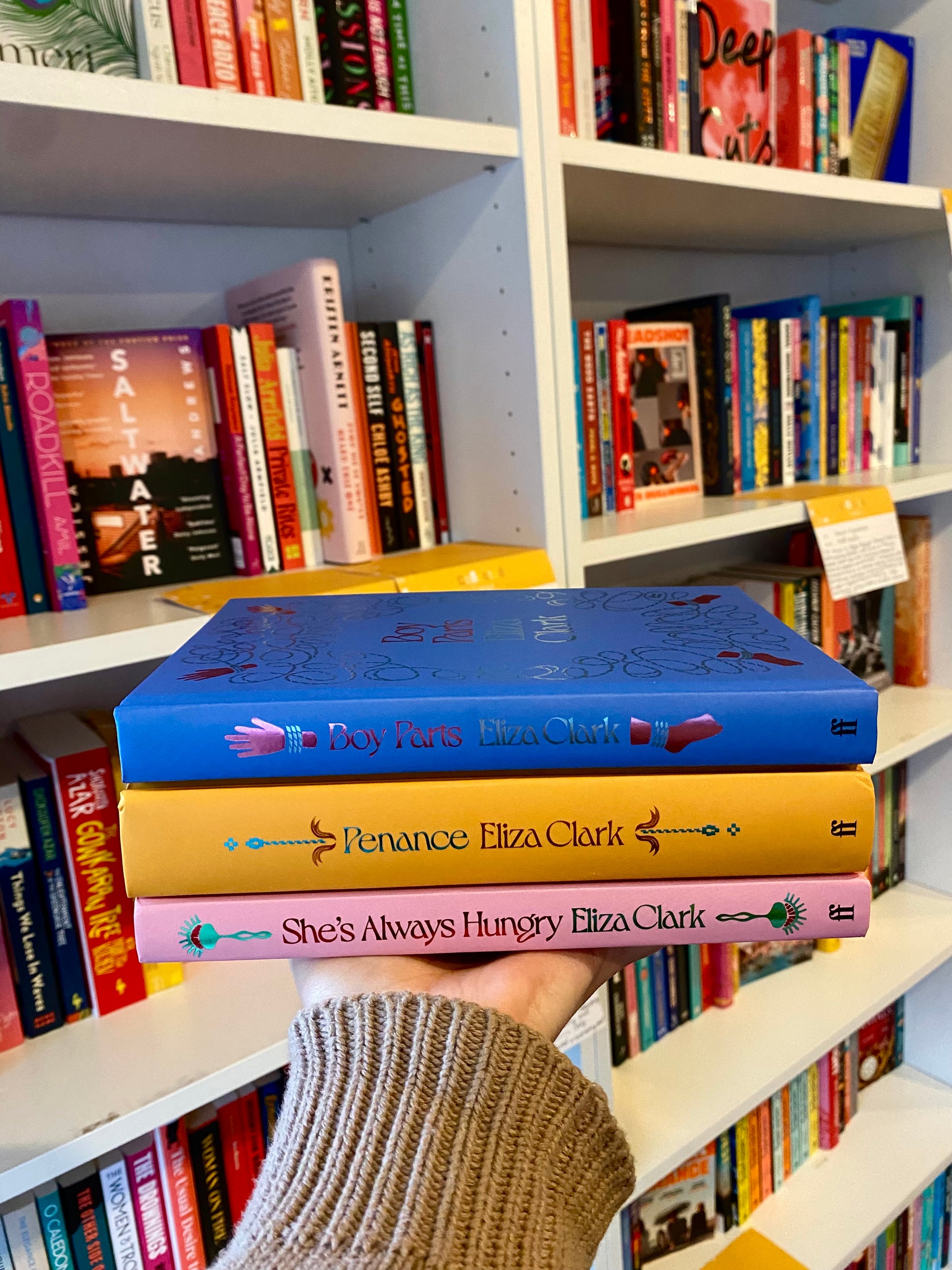 Boy Parts and Penance are both an unjacketed hardback with a printed edge, signed by the author. She's Always Hungry - please note this edition is an unjacketed hardback with foil finish but does not have a sprayed edge and is not signed.